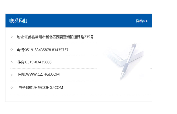地址:常州市新北區友邦商務大廈1幢16、17層  電話:0519-85101652  傳真:0519-85112595  郵編:213022  網址:www.cz-jiayue_cn.tongchenglaowu.com  郵箱:xiajifengaa@163.com